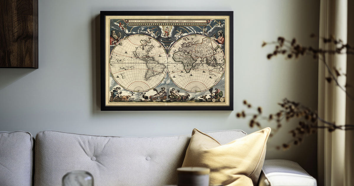 In 1648 Joan Blaeu published his revolutionary world map: Nova et Accuratissima Terrarum Orbis Tabula. This was the first map to illustrate the solar system following Copernicus’ heliocentric theory and to show the earth revolving around the sun.