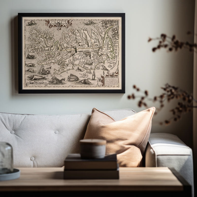 This sea monster map is a print of a re-engraving of Ortelius's famous Icelandic monster map believed to have been made by Jean Boisseau. Get the map alone or ready to hang with our beautiful floating framed canvas.