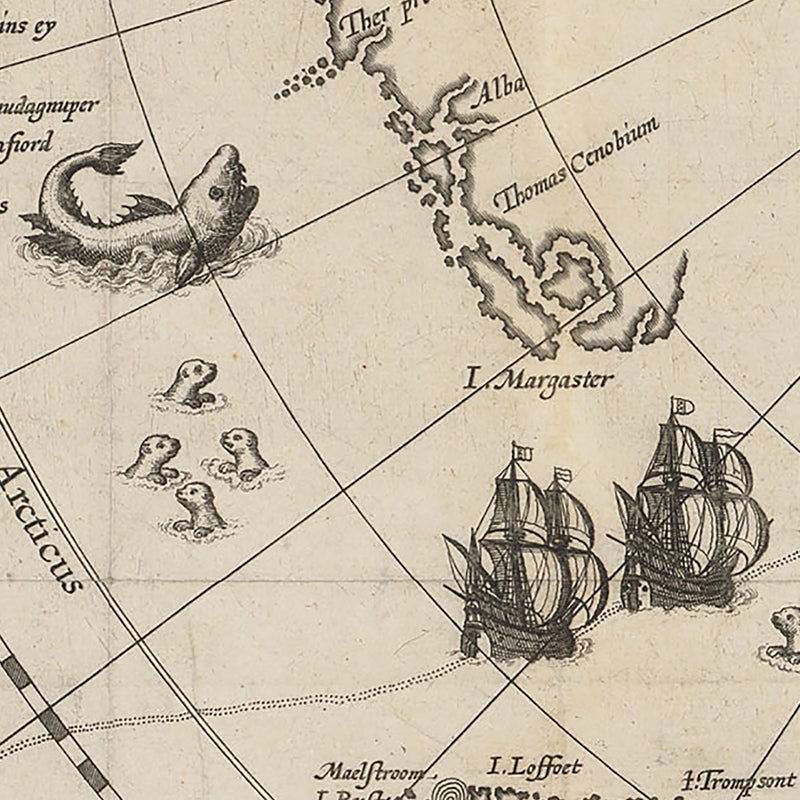 This beautiful map is a great piece of art, it is decorated with 34 illustrations of sea monsters, ships and whales. The map also shows the imaginary island of Frisland, an island named Polus Magnetis, and part of the North American continent labelled Estotiland. Other decorations include 3 compass roses and 3 cartouches with elaborate borders.